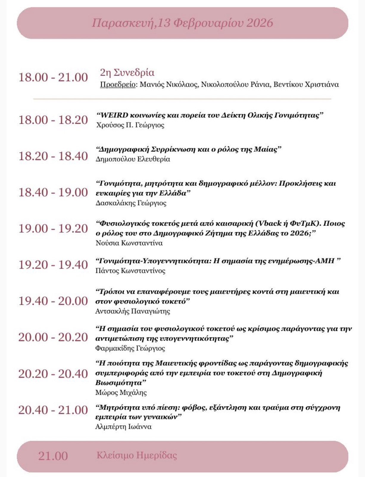 Σε μια κρίσιμη συγκυρία για το δημογραφικό μέλλον της χώρας, διακεκριμένοι επιστήμονες από τον χώρο της ιατρικής, της μαιευτικής και της κοινωνιολογίας θα αναλύσουν τις πολυδιάστατες αιτίες της υπογεννητικότητας. Η θεματολογία καλύπτει ένα ευρύ φάσμα, από την ανδρική Υπογονιμότητα και τις κοινωνικές ανισότητες στη μητρότητα, μέχρι τον ρόλο του φυσιολογικού τοκετού και της ποιότητας της μαιευτικής φροντίδας στη διαμόρφωση της δημογραφικής συμπεριφοράς.